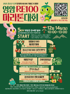 영암군에너지센터는 RE100(재생에너지 100%) 실천문화 확산을 위한 '영암 RE100 마라톤대회'를 14일 영암목재문화체험장 공영 주차장 일대에서 연다고 3일 밝혔다. 마라톤 코스는 5㎞ 단일이다. 영암목재문화체험장 공영 주차장을 출발해 할미교, 영암도기박물관, 상대포 역사공원, 반환지점인 구림교차로를 거쳐 영암목재문화체험장 공영 주차장으로 회