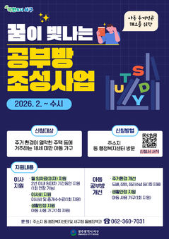 광주 서구는 아동주거빈곤가구의 생활환경을 개선하고 안정적인 성장 기반을 마련하기 위한 '꿈이 빛나는 공부방' 조성사업 참여자를 모집한다고 9일 밝혔다. 서구는 올해 예산 4000여 만원을 투입해 가구당 최대 300만원 범위에서 이사비와 월임차료, 중개수수료, 아동 맞춤형 가구 지원 등을 제공하고 이사가 어려운 가구에는 도배·장판 교체, 정리수납 등