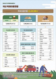 지난해 국내서 이뤄진 전체 목재이용과 유통업체 매출액이 모두 감소했으나 국내 목재생산업체의 매출액은 전년 대비 6.9%가 증가한 것으로 집계됐다. 2일 산림청이 발표한 '2024년 목재이용실태조사 결과' 자료에 따르면 지난해 전체 목재이용량은 2641만㎥로 2023년 2722만㎥ 보다 약 81만㎥(3.07%)가 감소했다. 이 중 수입목재 이용량(