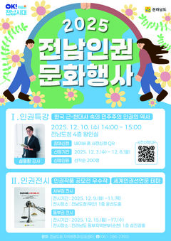 전남도는 세계인권선언 77주년을 맞아 9일부터 17일까지 인권 특강·인권공모전 우수작 전시회 등 올해 도민인권증진 문화행사를 연다고 3일 밝혔다. 10일 전남도청 4층 왕인실에서 열리는 인권특강에는 각종 방송 출연과 강연 활동으로 잘 알려진 역사 전문가이자 유튜브 크리에이터인 심용환 강사가 한국 근현대사 속 민주주의 인권의 역사를 주제로 강연에 나