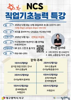 대구 서구청년센터는 청년들의 공공기관 취업 대비 역량 강화를 위해 청년마당 특강 'NCS 직업기초능력'을 운영한다고 4일 밝혔다. 특강은 실제 NCS(국가 직무능력 표준) 출제 경향을 반영한 의사소통·문제해결·자원관리·조직이해 등 핵심 직업기초능력을 높이는 내용으로 구성됐다. 교육은 9일부터 26일까지 매주 화·목요일 오후 7시부터 9시까지 총