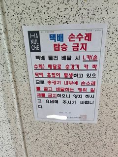 온라인 커뮤니티에 승강기 손상 방지를 이유로 '택배 손수레(대차) 탑승 금지' 안내문을 게시한 한 아파트 단지의 사진이 공개되며 논쟁이 일고 있다. 5일 온라인 커뮤니티 '보배드림'에는 '아파트 택배 손수레 탑승 금지 안내문'이라는 제목의 글이 올라왔다. 작성자가 공개한 안내문에는 '택배 물건 배달 시 손수레로 인해 승강기 내부 바닥 훼손이