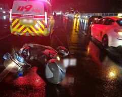 부산서 빗길에 넘어진 오토바이, 승용차가 '쾅'…1명 사망