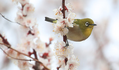 흐린 날씨를 보인 6일 오전 제주시 건입동의 한 매화 나무에 동박새가 날아와 꿀을 따먹고 있다. 기상청에 따르면 이날 전국 대부분 지역에 비 또는 눈이 내리고 바람도 강하게 불겠다. 낮 최고기온은 4~13도를 오르내리겠다.