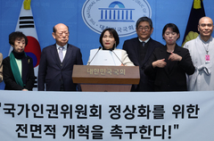 세계인권선언 77주년 인권의 날인 10일. 전직 국가인권위원회(인권위) 수장들이 국회에서 직접 사퇴를 촉구하고, 시민단체가 행사장 입장을 가로막는 등 안창호 위원장을 향한 퇴진 압박이 절정으로 치닫고 있다. 전·현직 인권위 관계자들은 이날 오전 11시20분께 서울 영등포구 여의도 국회 소통관에서 기자회견을 열고 "인권위가 방향을 잃은 난파