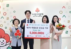 우리나라 수출 경쟁력 강화를 위해 노력한 공직자들이 받은 정부로부터 공로를 인정받아 지급 받은 포상금을 기부한 사연이 눈길을 끌고 있다. 사랑의열매 사회복지공동모금회는 24일 세종 사랑의열매 사무실에서 산업통상자원부 국가기술표준원 소속 팀 무역기술장벽(TBT) 배종수 연구관, 채예린 연구사, 윤지혜 전문위원 등이 참석한 가운데 특별 포상금 500