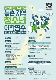 농림수산식품교육문화정보원(농정원)은 오는 29일까지 '2026년 한-뉴 FTA 농업협력사업 농촌지역 청소년 어학연수’ 참가자를 모집한다고 8일 밝혔다. 이번 사업은 2015년 12월 체결된 한-뉴 FTA에 따른 농업인 피해 보전 차원에서 마련된 것으로, 농업인 자녀를 대상으로 어학 능력 향상과 글로벌 의식 함양을지원하기 위해 추진된다. 지원 대상