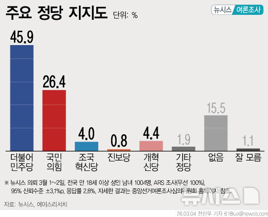 정당 지지도, 민주 45.9%·국힘 26.4%