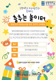 상명대 스포츠무용학부 무용예술전공은 2025학년도 상반기 대학혁신지원사업(SSIC) 소셜임팩트 분야의 일환으로 예술치유 프로그램을 운영했다고 2일 밝혔다. 이번 프로그램은 무용을 매개로 지역사회 구성원들의 정서적 안정과 심리적 회복을 지원하고자 마련된 사회공헌형 프로젝트다. 프로젝트는 발달장애 아동청소년을 위한 프로그램인 '춤추는 놀이터'로 구성