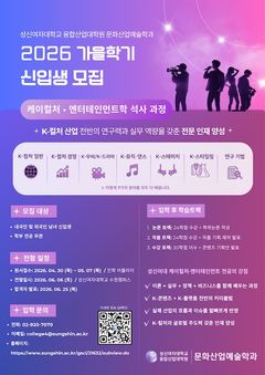 성신여대 융합산업대학원 문화산업예술학과는 가을학기 'K컬처·엔터테인먼트학' 석사과정의 내외국인 남녀 신입생을 모집한다고 20일 밝혔다. 해당 전공은 디지털·인공지능 전환(DX·AX)을 기반으로 한국의 콘텐츠 및 플랫폼을 학습하고 연구해, K-컬처 진흥과 글로벌 확산을 이끌 리더를 육성하는 데 중점을 두고 있다. 학위 취득 과정은 ▲논