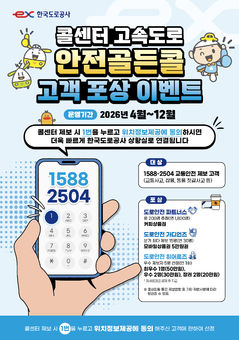 한국도로공사(사장 직무대행 이상재)는 '고속도로 안전골든콜 포상 이벤트'를 실시한다고 8일 밝혔다. 이벤트는 오는 12월까지 교통사고, 노면잡물 등 교통안전 관련 내용을 콜센터로 제보한 고객을 대상으로 실시한다. ‘안전골든콜’ 포상 제도는 고속도로 이용자의 자발적 교통안전 관련 제보를 유도해 사고 처리시간을 단축하고, 신속한 대응으로 사고를