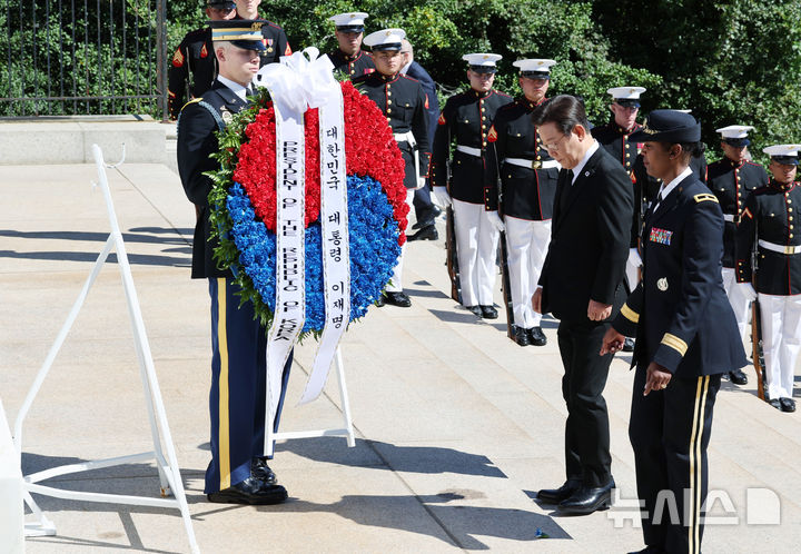 이재명 대통령은 26일(현지시간) 미국 워싱턴DC 알링턴 국립묘지 헌화로 방미 3일차 일정을 시작했다. 이 대통령은 현지 시간으로 26일 오전 알링턴 국립묘지를 방문해 무명용사탑에 헌화했다. 김혜경 여사도 일정에 동행했다. 화환은 태극무늬 형상으로 준비됐으며, 리본에는 '대한민국 대통령 이재명', 'President of the Republic o