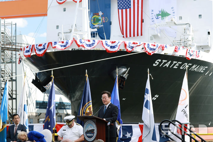 이재명 대통령은 26일(현지시간) 미국 필라델피아에 위치한 한화 필리조선소를 방문해 "MASGA(마스가) 프로젝트로 미국 조선업과 대한민국 조선업이 더불어 도약하는 윈윈(win-win)의 성과를 만들어낼 것"이라고 밝혔다. 이 대통령은 26일 오후 한화 필리조선소에서 진행된 국가안보다목적선 '스테이트 오브 메인'호 명명식 축사를 통해 이같이 말했다