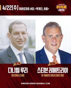 미국 캘리포니아주 샌프란시스코와 대한민국 서울이 이정후(샌프란시스코 자이언츠)로 연결된다. 키움은 오는 22일 오후 서울 고척스카이돔에서 열리는 2026 신한 쏠 KBO리그 NC 다이노스와의 경기에 다니엘 루리 샌프란시스코 시장과 스티븐 레베트리아 샌프란시스코 자이언츠 엔터프라이즈 사장이 방문한다고 20일 밝혔다. 키움은 이날 경기를 '투게더