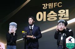 프로축구 K리그1 강원FC '신예' 이승원(22)이 올 시즌 K리그1 영플레이어상을 수상했다. 이승원은 1일 서울 서대문구 스위스그랜드호텔에서 열린 하나은행 K리그 2025 대상 시상식 중 K리그1 영플레이어상을 수상했다. 100점을 기준으로 환산하면 66.87점(감독 10표, 주장 6표, 미디어 90표)의 압도적인 지지를 받았다. 2위