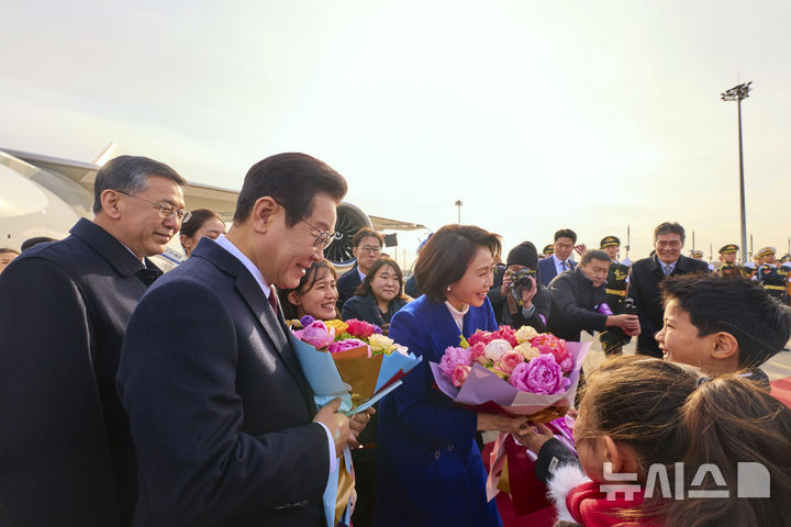 베이징 도착해 꽃다발 받는 이재명 대통령-김혜경 여사
