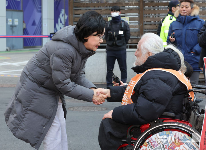 출근 중 전장연 대표와 대화하는 이혜훈 후보자