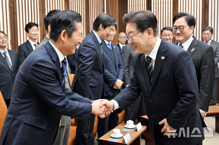정청래 대표와 인사하는 이재명 대통령