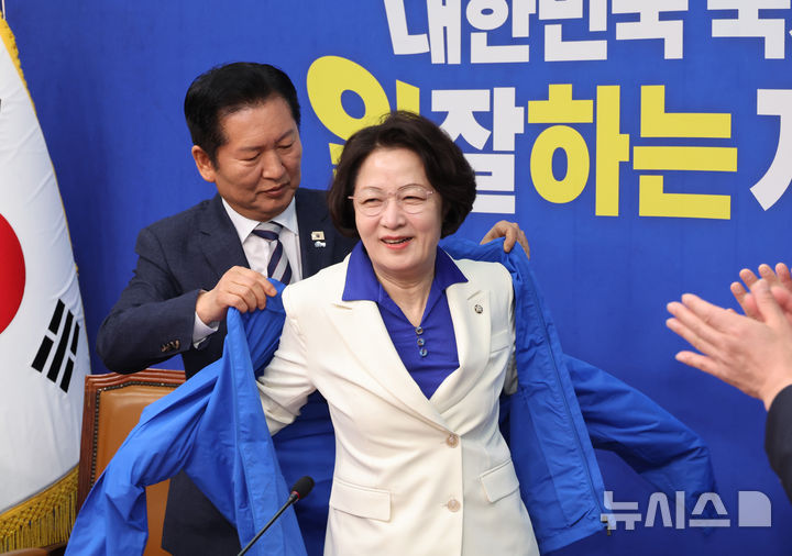 정청래 대표에게 당 점퍼 받아 입는 추미애 경기지사 후보
