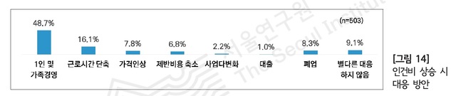 최저임금 인상에 대응하는 방식을 묻자 '1인 및 가족 경영'(48.7%)이나 '근로시간 단축'(16.1%) 등 사업주 노동시간을 늘리거나 종사자 노동을 줄이는 식으로 대응하겠다는 답변이 64.8%였다.