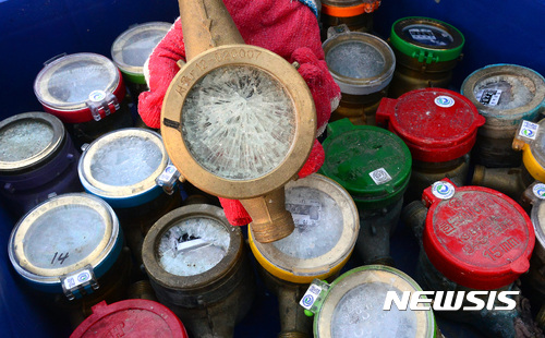 【서울=뉴시스】김선웅 기자 = 전국적으로 한파가 기승을 부리며 수도계량기 동파사고가 이어지는 가운데 24일 오후 서울 종로구 중부수도사업소 효자가압장에 동파된 수도계량기가 놓여있다. 2017.01.24.