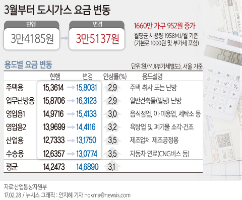 【서울=뉴시스】안지혜 기자 = 산업통상자원부는 오는 3월1일부터 도시가스 요금을 평균 3.1% 인상한다고 28일 밝혔다.