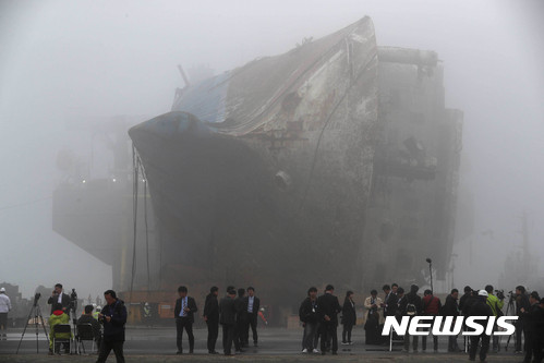 【목포=뉴시스】강종민 기자= 해양수산부는 6일 세월호 육상 이송 장비가 선체 무게를 감당하기 어려워 추가 보완 테스트가 필요하다고 밝혔다. 취재진들이 이날 안개속 세월호를 바라보고 있다. 2017.04.06.
