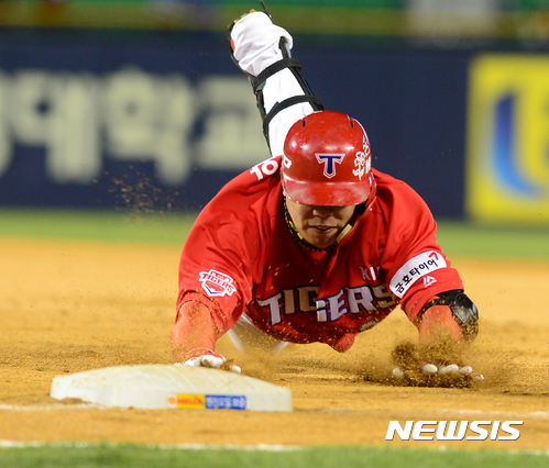 【서울=뉴시스】박주성 기자 = 12일 오후 서울 잠실야구장에서 열린 2017 KBO 리그 기아 타이거즈 대 두산 베어스의 경기, 7회초 노아웃 주자 3루에서 기아 나지완이 안타를 친 후 2루 주루를 시도하다 다시 1루로 돌아오고 있다. 2017.04.12.