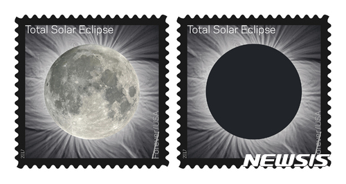 【미국 우체국·AP/뉴시스】미국 우체국이 발간한 '개기일석 포에버' 기념우편. 오는 8월 21일 달이 지구와 태양 사이를 지나면서 태양을 완전히 가리는 개기일식이 벌어지게 된다. 왼쪽 우표의 가운데를 손으로 누르면 체온에 반응해 까맣게 변해 일식 이미지가 나타나게 된다. 2017.04.28