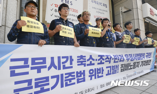 【서울=뉴시스】최진석 기자 = 1일 오전 서울 종로구 광화문우체국 앞에서 민주총 전국집배노동조합 주최로 진행된 '근무시간 축소-조작-반려 우정사업본부 규탄! 근로기준법 위반 고발! 집배노동자 기자회견'에서 전국집배노동조합 최승묵(앞줄 왼쪽 네번째) 위원장이 우정사업본부 규탄 발언을 하고 있다. 2017.09.01.