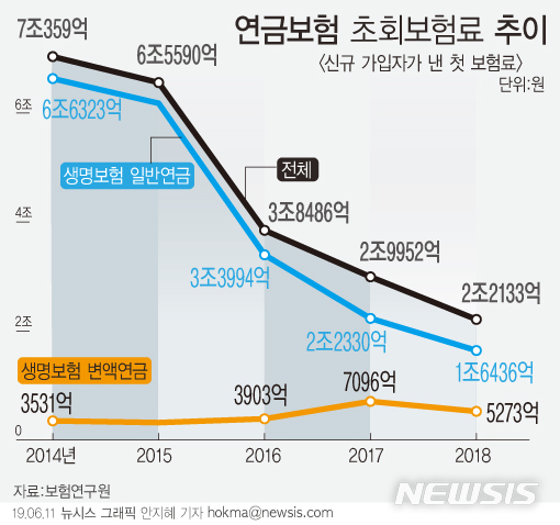 【서울=뉴시스】11일 보험연구원이 발표한 '연금보험시장 부진의 원인과 과제' 리포트에 따르면 보험업권에서 판매 중인 연금보험 초회보험료는 2014년 7조에서 2018년 2조 수준으로 줄어들었다. (그래픽=안지혜 기자)