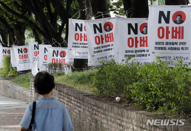 【서울=뉴시스】최동준 기자 = 11일 서울 서대문형무소 앞에 아베규탄서대문행동이 설치한 아베 정부 규탄 현수막이 걸려 있다. 2019.08.11.