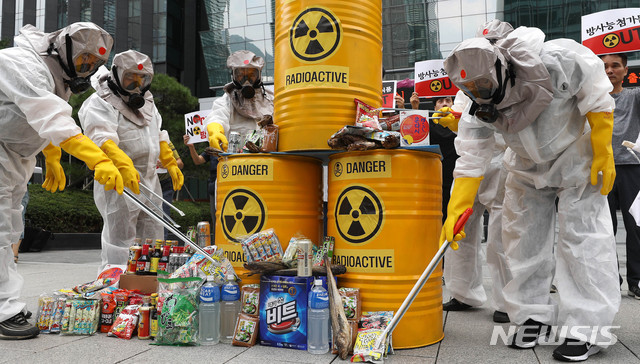 【서울=뉴시스】추상철 기자 =한국중소상인자영업자총연합회 회원들이 28일 오전 서울 종로구 구 일본대사관 앞에서 일본제품 판매중단 확대 3차 기자회견을 열고 일본 아베정권을 규탄하며 퍼포먼스를 하고 있다. 2019.08.28.