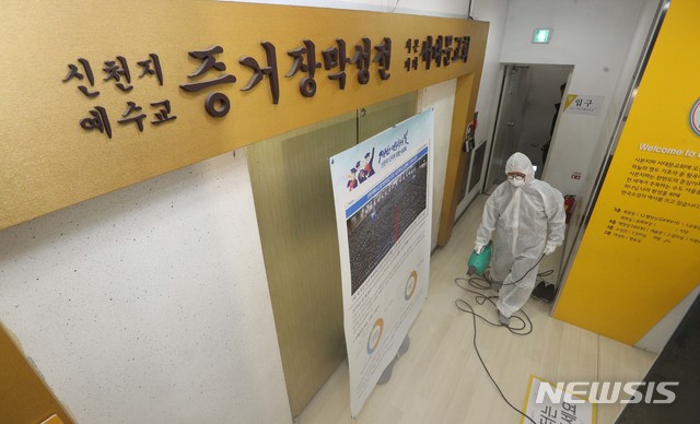 [서울=뉴시스]김병문 기자 = 방역 관계자가 21일 서울의 한 신천지 교회에서 신종 코로나바이러스 감염증(코로나19) 예방 소독 작업을 하고 있다. 2020.02.21.