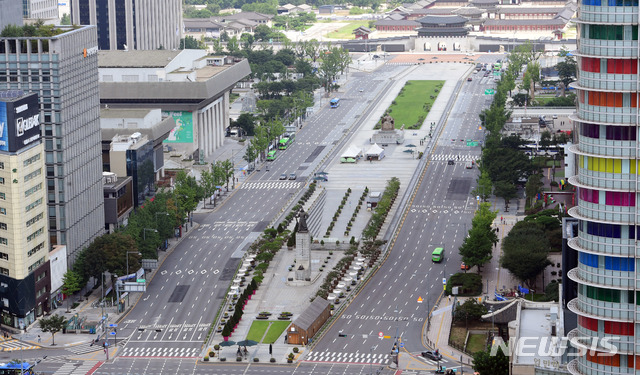 [서울=뉴시스]사진공동취재단 = 코로나19 확산으로 사회적거리두기 2단계가 발령되면서 23일 서울 광화문 일대 도로가 텅 빈 모습을 보이고 있다. 2020.08.23.