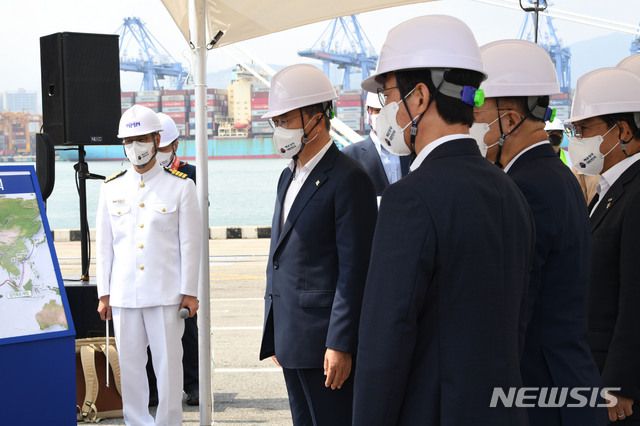 [서울=뉴시스]김진아 기자 = 문재인 대통령이 29일 부산신항 4부두에서 열린 해운산업 리더국가 실현전략 선포 및 1.6만TEU급 한울호 출항식에서 강은수 HMM 한울호 선장으로부터 운항계획을 보고받고 있다. 2021.06.29. [email protected]