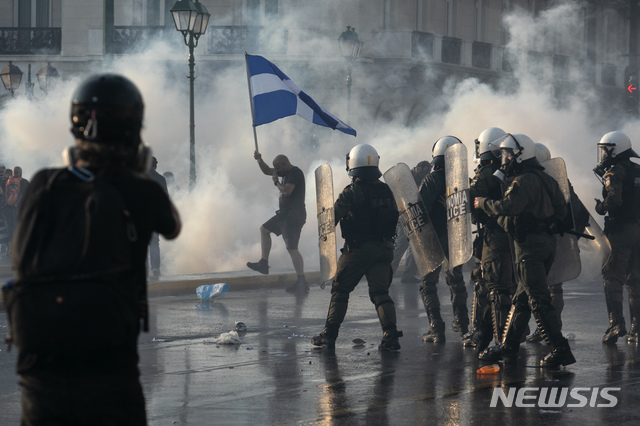 백신 반대 시위대에 최루탄 쏘는 그리스 경찰