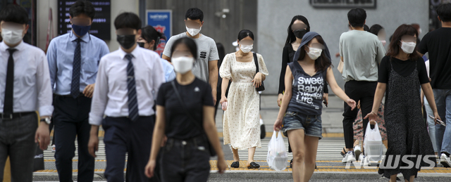 [서울=뉴시스] 정병혁 기자 = 정부가 수도권 4단계, 비수도권 3단계 사회적 거리두기 조치를 이달 22일까지 2주 연장한다고 발표한 6일 오후 서울 강남구 강남역 인근 횡단보도에서 마스크를 쓴 시민들이 발걸음을 옮기고 있다. 2021.08.06. [email protected]