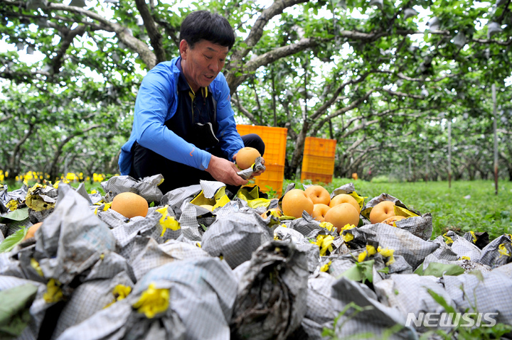 [순천=뉴시스] 이영주 기자 = 제11호 태풍 '힌남노'(HINNAMNOR)가 지나간 6일 오전 전남 순천시 낙안면 한 배 과수원에서 이곳 주인 김만진(69)씨가 떨어진 배들을 보며 안타까워하고 있다. 2022.09.06. [email protected]