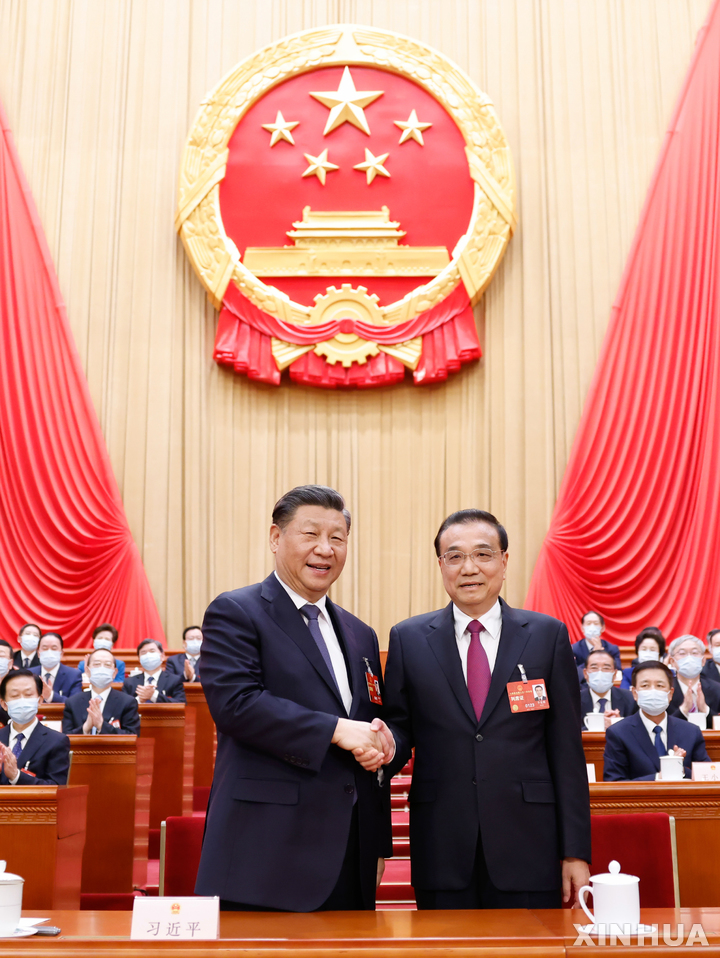 [베이징=신화/뉴시스] 시진핑(왼쪽) 중국 국가주석이 11일 베이징 인민대회당에서 열린 제14차 전국인민대표대회 제1차 회의 제4차 전체 회의에서 리커창 전 총리와 악수하고 있다. 이날 리창 중앙정치국 상무위원이 국무원 총리로 선출됐다. 2023.03.12.