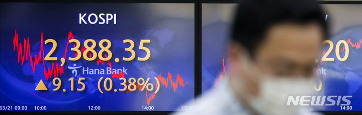 [서울=뉴시스] 정병혁 기자 = 코스피가 전 거래일(2379.20)보다 9.15포인트(0.38%) 상승한 2388.35에, 코스닥지수는 전 거래일(802.20)보다 0.33포인트(0.04%) 오른 802.53에 거래를 종료했다. 서울 외환시장에서 원·달러 환율은 전 거래일(1310.1원)보다 1.1원 뛴 1311.2원에 마감했다. 21일 오후 서울 중구 하나은행 딜링룸에서 직원들이 업무를 보고 있다. 2023.03.21. [email protected]
