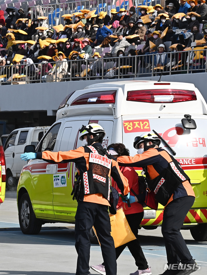 [수원=뉴시스] 김종택 기자 = 21일 오후 경기도 수원시 장안구 수원종합운동장에서 '다중밀집시설 지진 발생, 인명 압사 사고' 상황을 가장한 수원시 재난대응 민·관·군 합동 종합훈련이 실시되고 있다. 2023.03.21. [email protected]