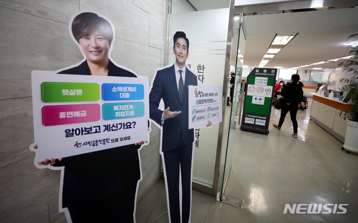 [서울=뉴시스] 조성봉 기자 = 27일 오후 서울 중구 서민금융지원센터로 시민이 들어서고 있다. 금융위원회는 최대 100만원까지 소액의 생계자금을 신청 당일 지원받을 수 있는 '소액생계비대출' 상품을 이날 출시했다. 2023.03.27. [email protected]