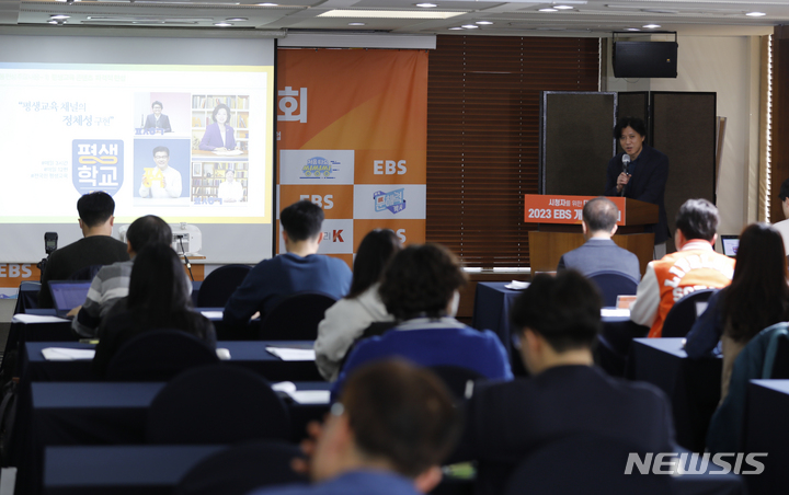 [서울=뉴시스] 고승민 기자 = 김형준 EBS 편성기획부장이 28일 서울 프레스센터에서 열린 2023 EBS 개편 설명회에서 개편 설명을 하고 있다. 2023.03.28. [email protected]
