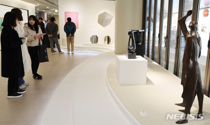 [서울=뉴시스] 김명원 기자 = 28일 서울 종로구 세종문화회관 미술관 및 일대에서 열린 2023 아트서울 특별전 <조각의 시간:울림>에서 관람객들이 20세기부터 현재까지 대한민국 조각의 역사를 이끌어온 원로조각가 들의 작품을 감상하고 있다. 2023 아트서울 특별전은 28일부터 내년 2.29(목)까지 ▲김정숙 작가(1917~1991)의 대표작(여인흉상, 비상), ▲송영수 작가(1930~1970)의 대표작 <효>, <토템>, ▲최만린 작가(1935~2020)의 대표작 <태(胎)79-18>, <0 01-2>, ▲박병욱 작가(1939~2010)의 대표작<만월(滿月)>, <추일(秋日)>, ▲김인겸 작가(1945~2018)의 대표작<Space-Less>, <묵시공간>, ▲박충흠 작가(1946~)의 대표작 <무제(2014)> ▲박일순 작가(1951~)의 대표작 <봄의 정령>, ▲김정희 작가(1954~)의 대표작<Space 2022-idea> 총 13점의 작품을 만나볼 수 있다. 2023.11.28. [email protected]