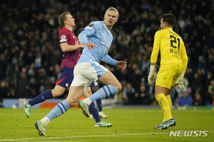 [맨체스터=AP/뉴시스] 맨체스터 시티(영국)의 엘링 홀란이 28일(현지시각) 영국 맨체스터의 에티하드 스타디움에서 열린 2023-24 유럽축구연맹(UEFA) 챔피언스리그(UCL) 조별리그 G조 5차전 라이프치히(독일)와 경기 후반 9분 추격 골을 넣고 기뻐하고 있다. UCL 16강 진출을 조기 확정했던 맨시티는 이날 0-2로 끌려가다 후반 세 골을 넣으며 3-2로 역전승했고 홀란은 득점 공동 선두(5골)로 올라섰다. 2023.11.29.