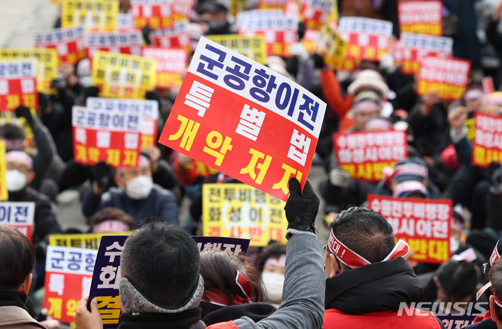 [서울=뉴시스] 추상철 기자 = 수원전투비행장 화성이전반대 범시민대책위원회가 29일 오전 서울 여의도 국회 인근에서 수원전투비행장 화성이전반대 집회를 하고 있다. 2023.11.29. [email protected]