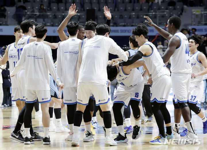 [고양=뉴시스] 최동준 기자 = 10일 경기 일산서구 고양 소노 아레나에서 열린 2023-2024 KBL 리그 고양 소노 스카이거너스 대 대구 한국가스공사 페가수스의 경기, 84:76으로 승리한 한국가스공사 선수들이 기뻐하고 있다. 2023.12.10. [email protected]