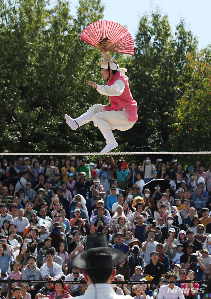 [서울=뉴시스] 김진아 기자 = 추석인 29일 서울 중구 남산골한옥마을에서 열린 2023 남산골 한가위 축제 '추우석'에서 시민들이 남창동줄타기 공연을 보고 있다. 2023.09.29. [email protected]