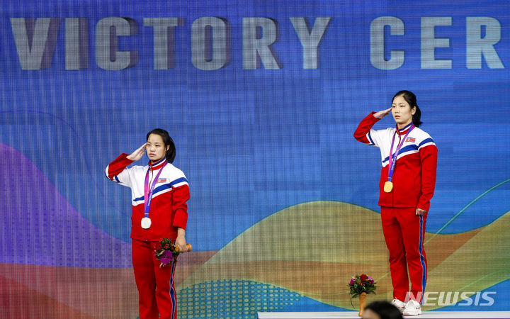 [항저우=뉴시스] 정병혁 기자 = 30일 중국 항저우 샤오산 스포츠센터에서 열린 2022 항저우 아시안게임 역도 여자 55kg급에서 금메달을 차지한 북한 강현경과 은메달을 차지한 리수연이 국가를 부르고 있다. 2023.09.30. [email protected]